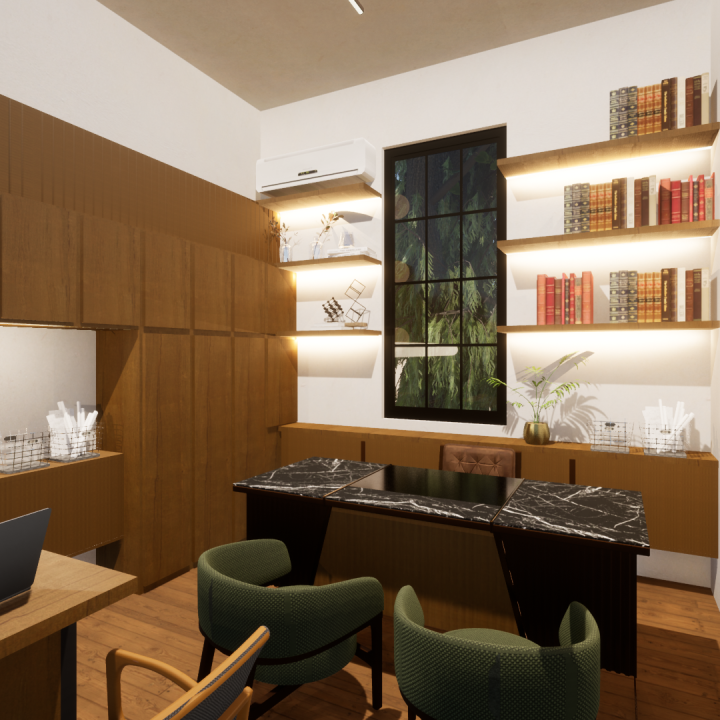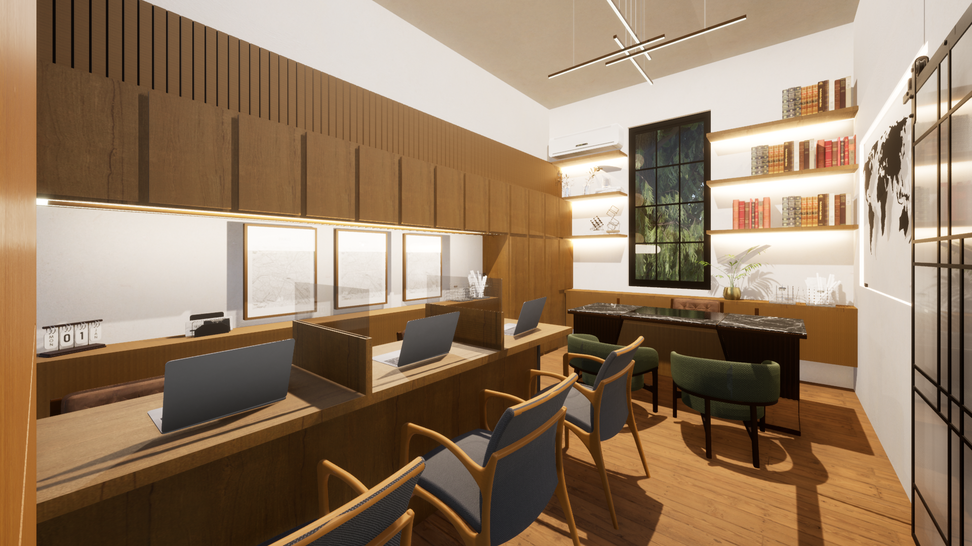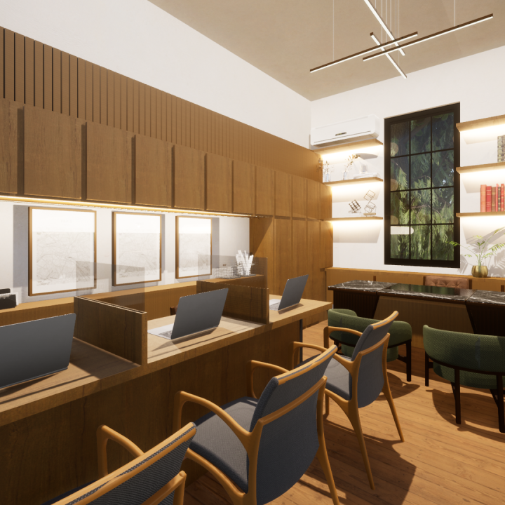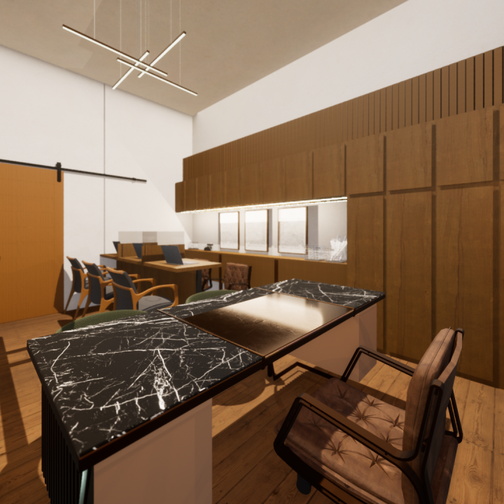 Ambiente administrativo com espaços para atendimento e armazenamento, sempre levando em consideração o fluxo do espaço, acessibilidade e uma estética atemporal.